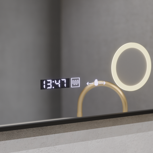 LUSSO LED érintőtükör, páramentesítő rendszer, óra és hőmérséklet, 50 cm, szálcsiszolt arany keret