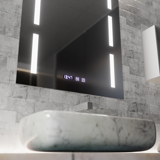 Négyszögletű LED tükör, 80x60 cm, Venezia MotionGlow Marcello érzékelő, páramentesítő rendszer, óra és hőmérő, Dimabila