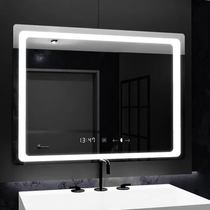 Téglalap alakú LED -tükör, 120x80 cm, MotionGlow Marcello érzékelő, letiltási rendszer, óra és hőmérő, kozmetikai nagyító