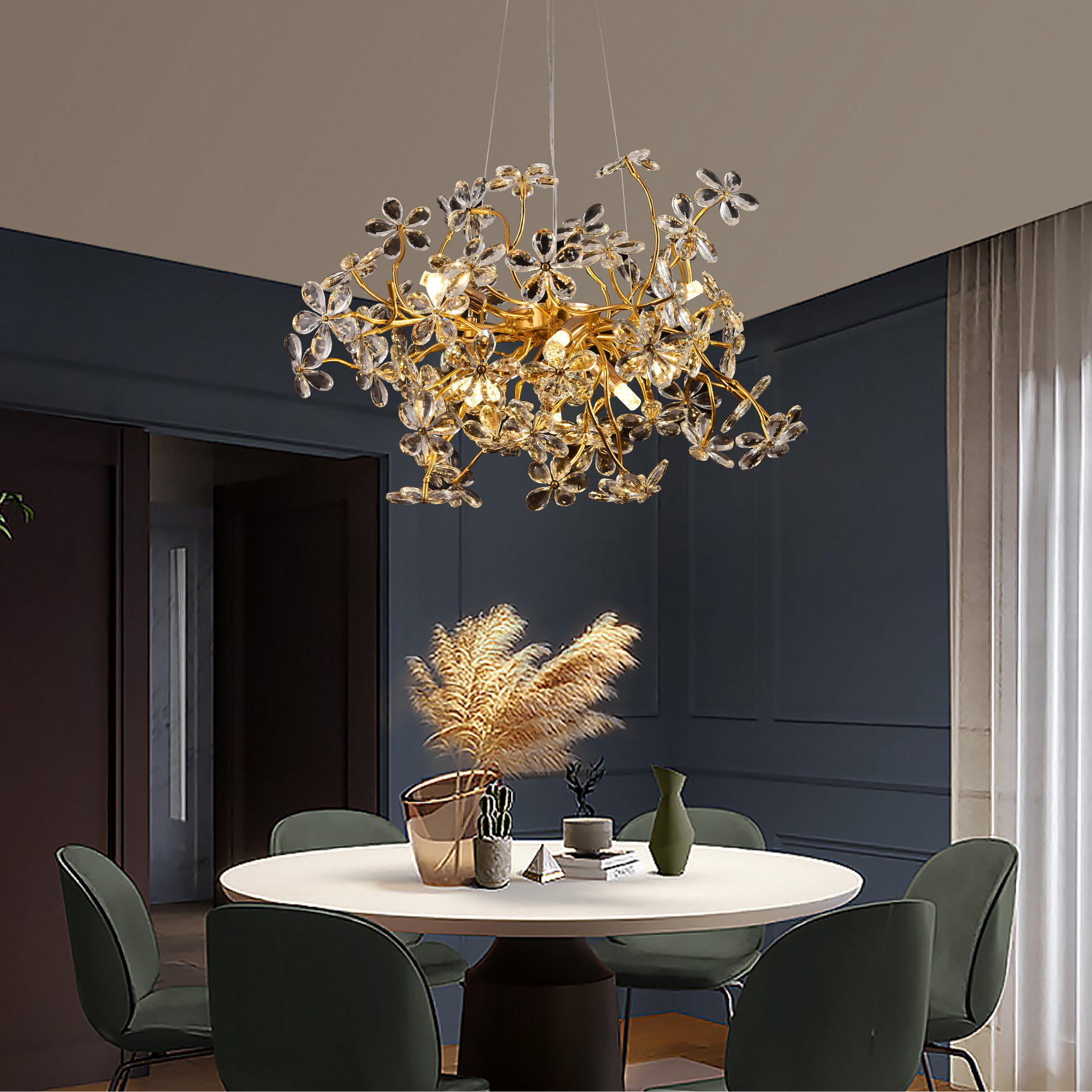 A CM325/600GD kristálycsillár egy elegáns lámpatest modern dizájnnal és fényűző akcentussal, ideális a kifinomult belső terekhez. 9 db G9-es aljzattal felszerelve hatékony és egyenletes világítást biztosít, alkalmas nappaliba, étkezőbe vagy igényes folyosókba.
