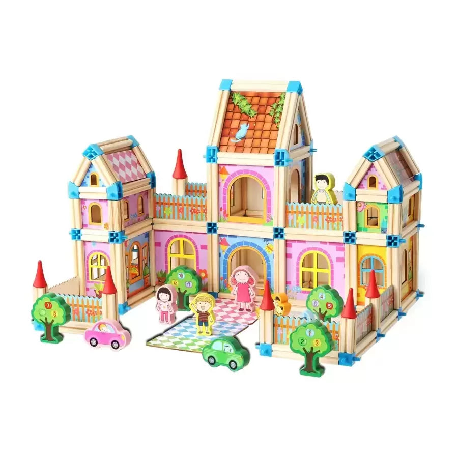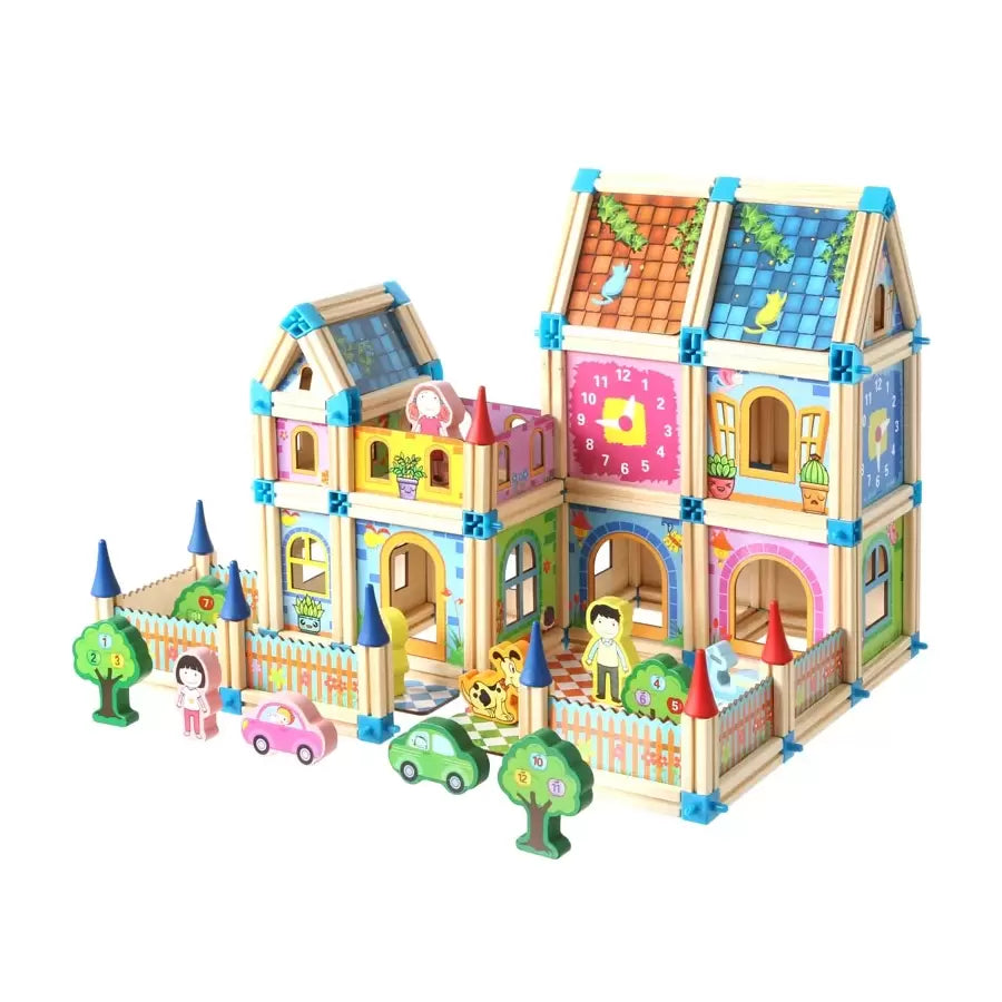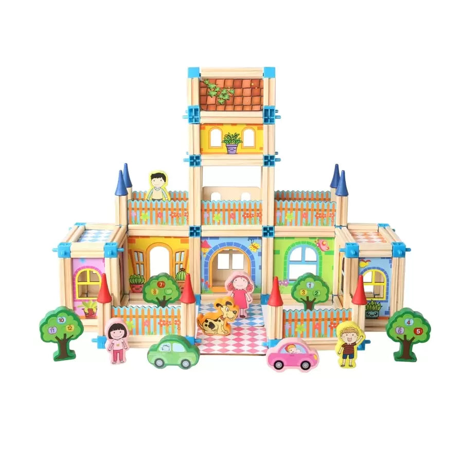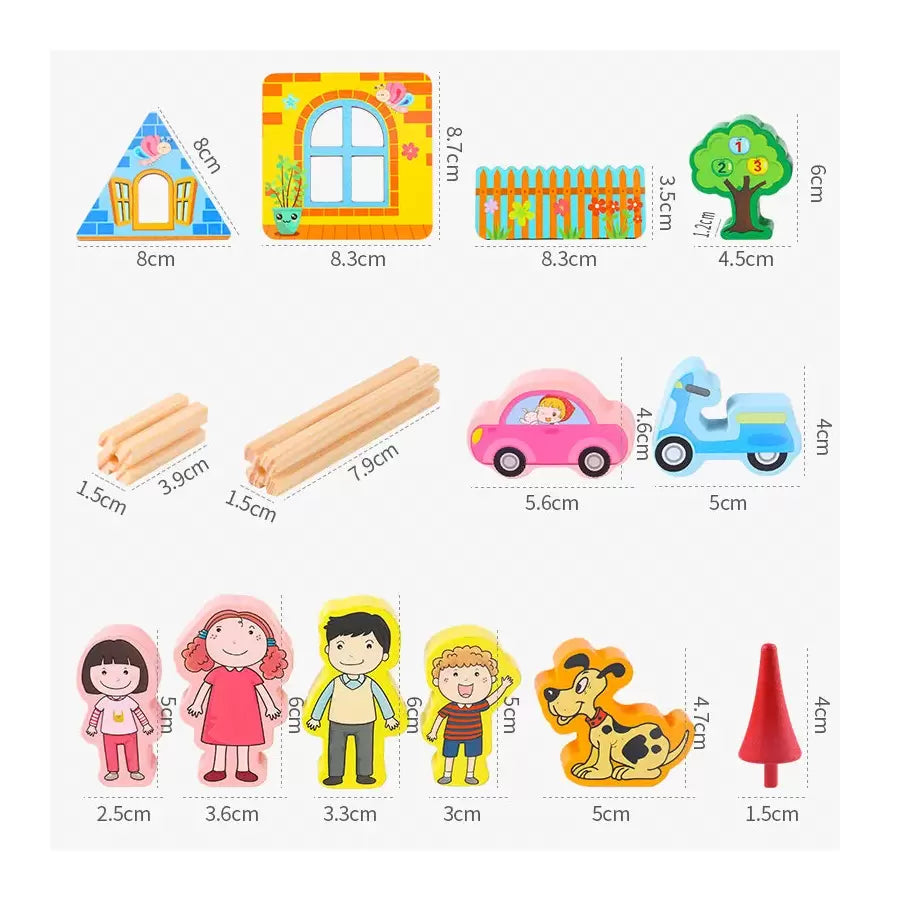 Az építési alkatrészek fából készülnek, és ABS műanyag ízületekkel rendelkeznek, ezáltal biztosítva a megfelelő ellenállást és tartósságot. A csomag különféle illusztrált figurákat, valamint a ház falát tartalmazza, különféle vidám illusztrációkkal.