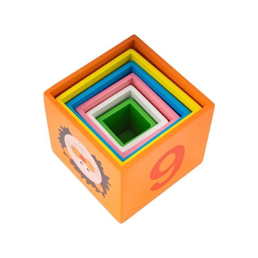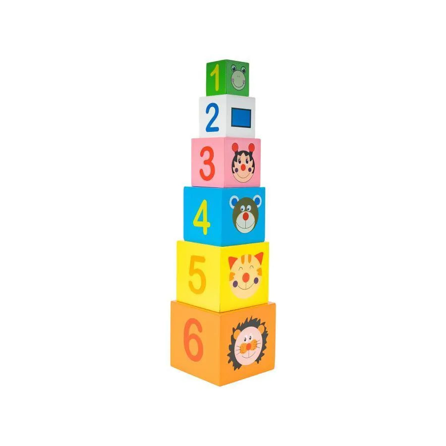 Interaktív játékkocka állatokkal, 6 darab, fa