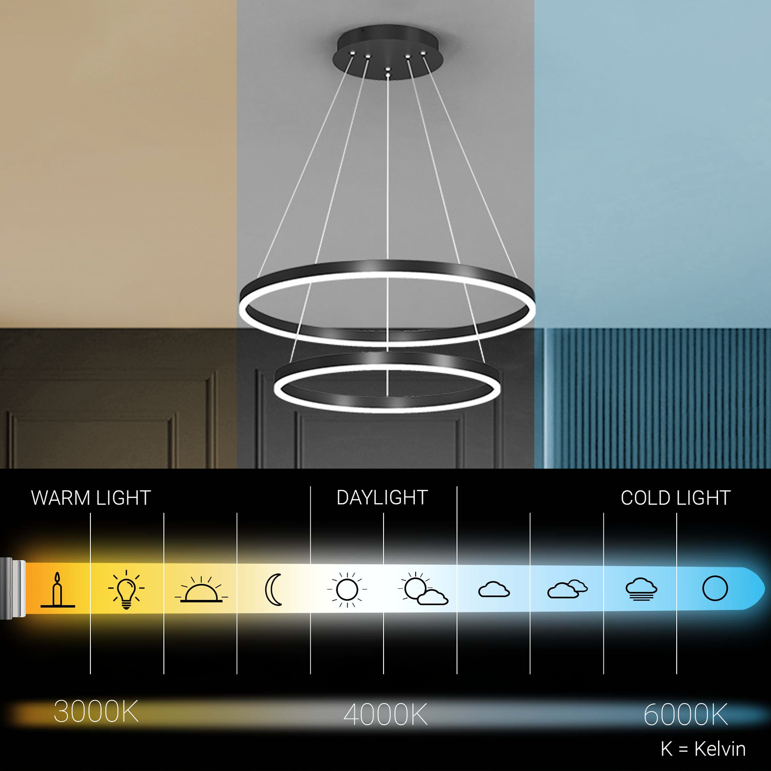 Függesztett LED csillár távirányítóval CASIANA 41W, 2 kör, hideg/meleg/semleges fény, szabályozható, fekete, állítható magasságú