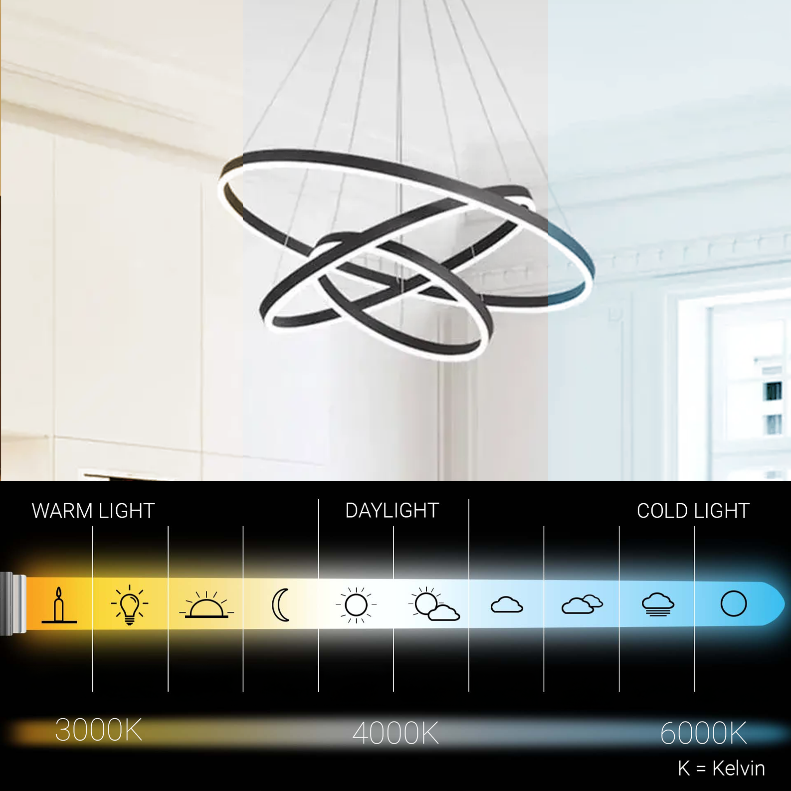 ⚠️ ÓVATOS!: Egy bizonyos színhőmérséklet beállítását csak akkor lehet megtenni, ha a csillárokat leállítják és a távirányítóból indítják. Mindkettő a távvezérlővel rendelkező csillároknál, a kapcsoló egymást követő megnyomása megváltoztatja a fénytípust.