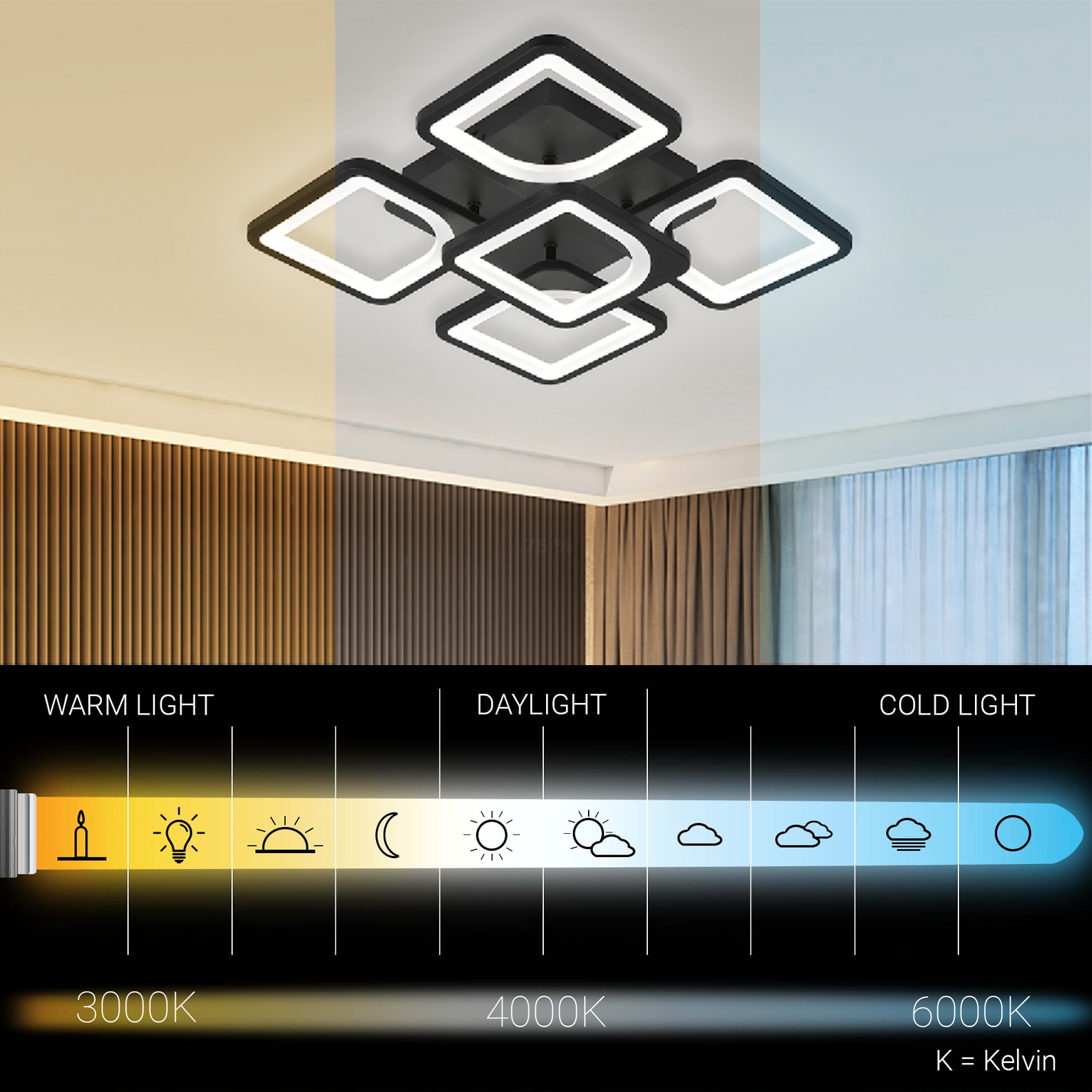 Az öt négyzetet, amelyek valószínűleg érdekes látványegyüttest alkotva vannak elrendezve, LED-ekkel világítják meg a színhőmérséklet kiválasztásának lehetőségével. A távirányító segítségével választhat a hideg fény (az energizáló környezetért), a meleg (a barátságos és pihentető légkör érdekében) vagy a semleges (az általános világítás érdekében). A fényerőszabályzó funkció lehetővé teszi a fény intenzitásának a minden pillanatnak tökéletesen megfelelő beállítását.