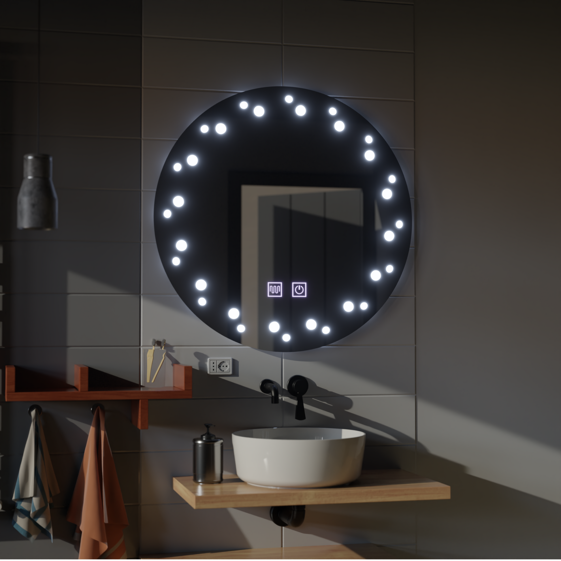 Kerek LED -tükör, 60 cm, Micah Motionglow érzékelő Marcello, leolvasztási rendszer, óra és hőmérő, kozmetikai lupa, dimálható
