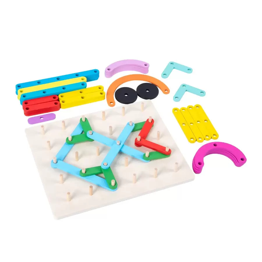 A „Geoboard Alphanumeric and Shapes” Montessori játék egy sokoldalú fából készült eszköz, amely segít a gyerekeknek kreatív lenni és új fogalmakat tanulni.