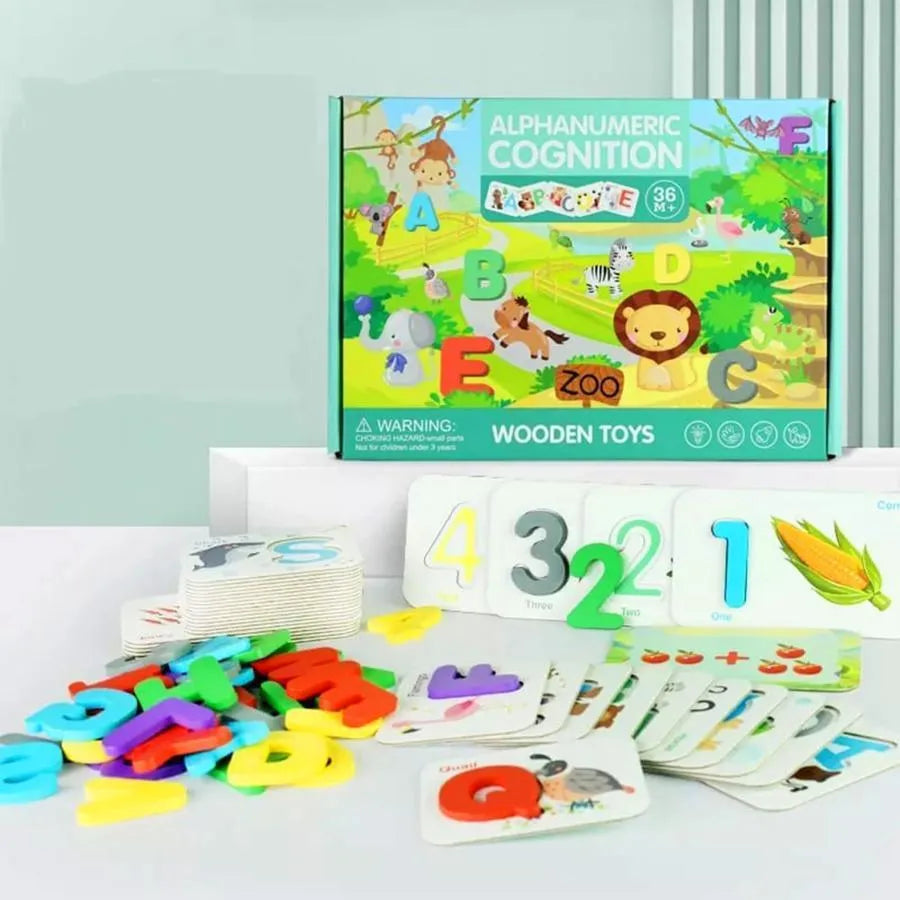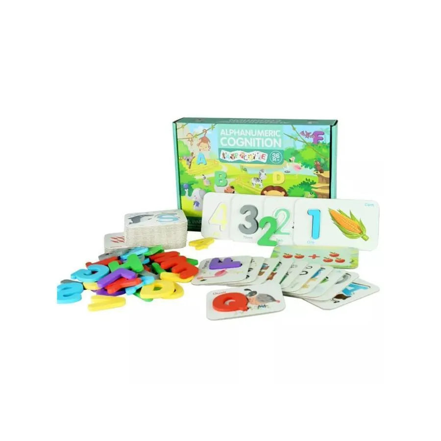 Oktatási játék típusú betűk és számok ábécé állatokkal, zöldségekkel és gyümölcsökkel, fa és kartonnal