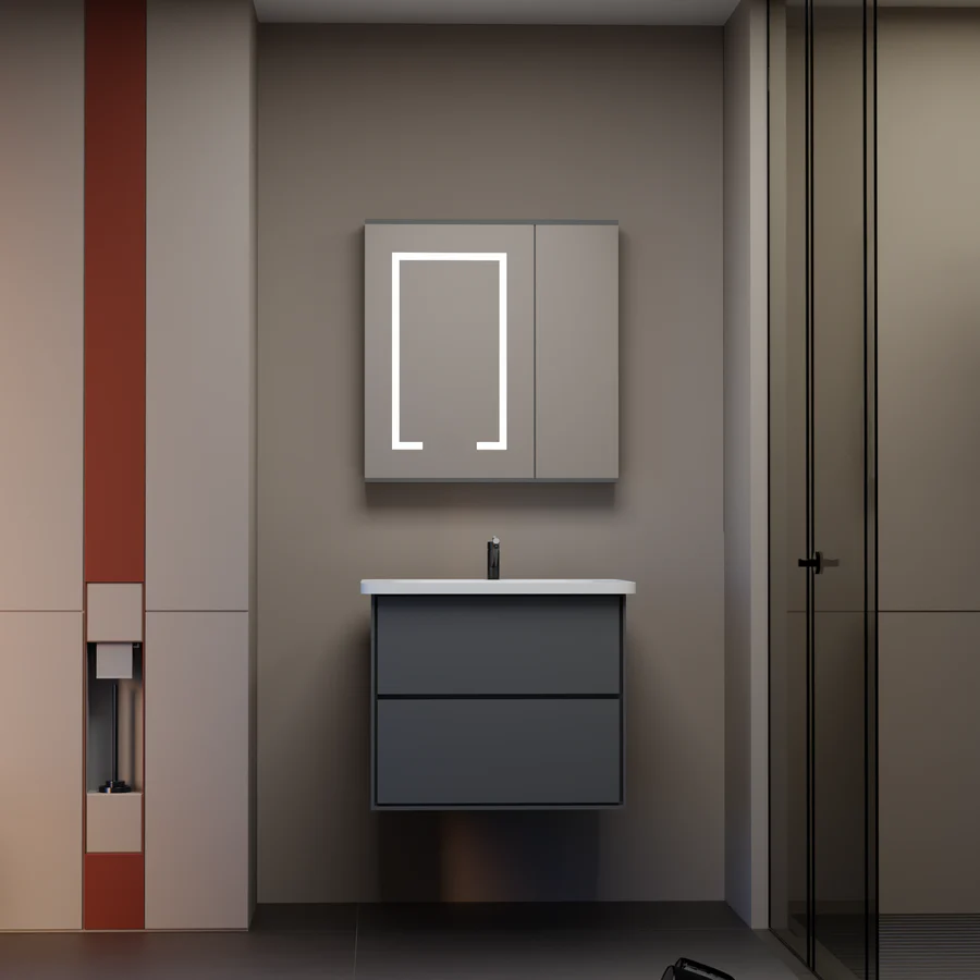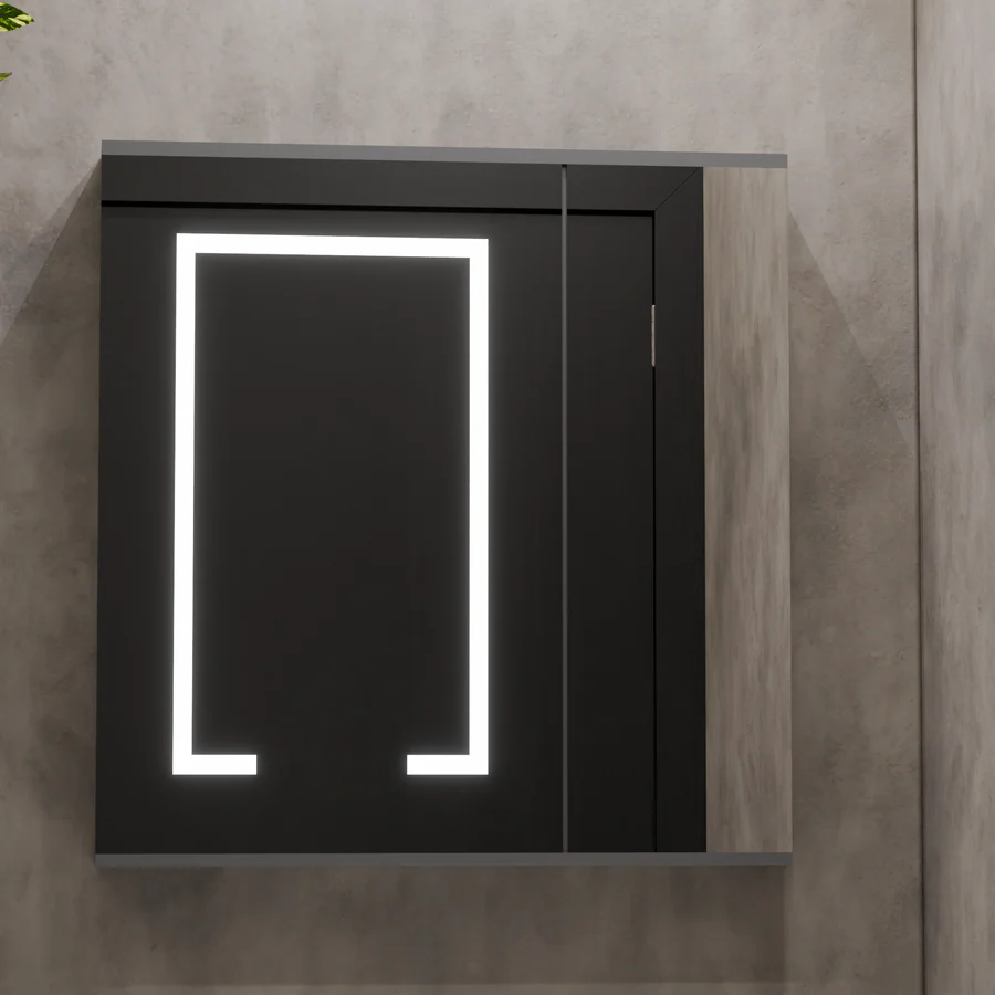 Felső test (LED tükörbútorok): Ez egy felfüggesztett iroda, amely tükröt tartalmaz az elülső oldalon. A LED -es világítási rendszert integrálják a tükör kontúrjába, és kivetítik a fényt kívülről, hozzájárulva a fürdő általános környezetéhez. A tükör mögött található a kozmetikai és higiéniai termékek szervezésére szolgáló tárolóhely.