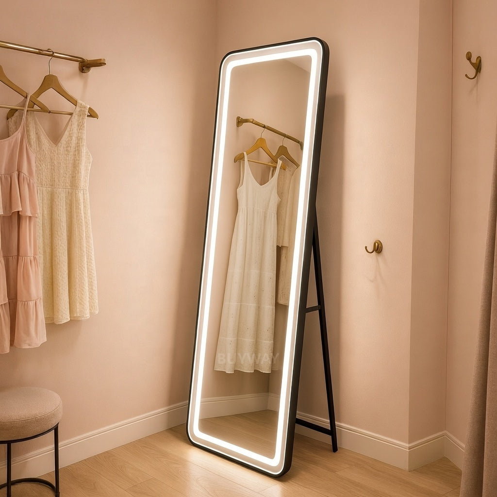 Négyszögletű LED-es tükör, fekete keret, 50x160 cm, szabályozható, hideg/meleg/semleges fény, öltözködési stílus