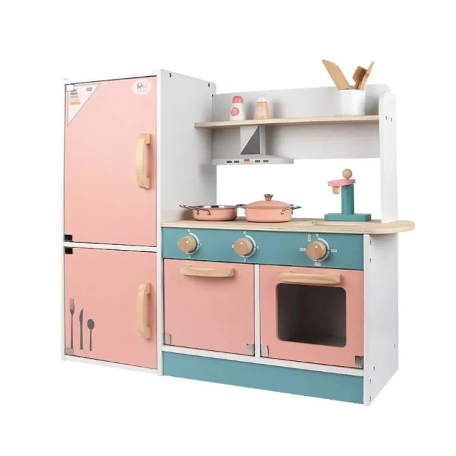 Teljes konyhai típusú játék különféle kiegészítőkkel és hűtőszekrényekkel, 45 darab, türkiz rózsaszínű, fa
